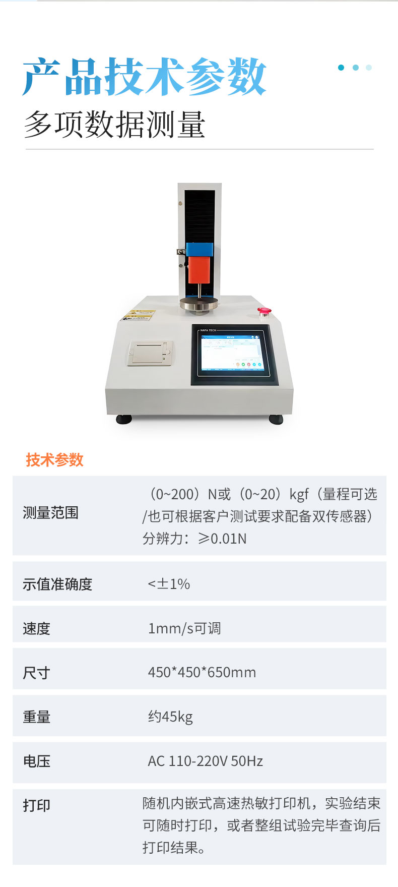 1、测量范围:(0~200)N或(0~20)kgf(量程可选/也可根据客户测试要求配备双传感器)分辨力:≥0.01N