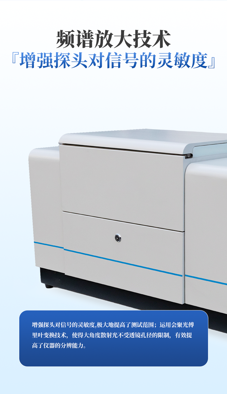 | 频谱放大技术 | 增强探头对信号的灵敏度,极大地提高了测试范围;运用会聚光傅里叶变换技术,使得大角度散射光不受透镜孔径的限制,有效提高了仪器的分辨能力。 |