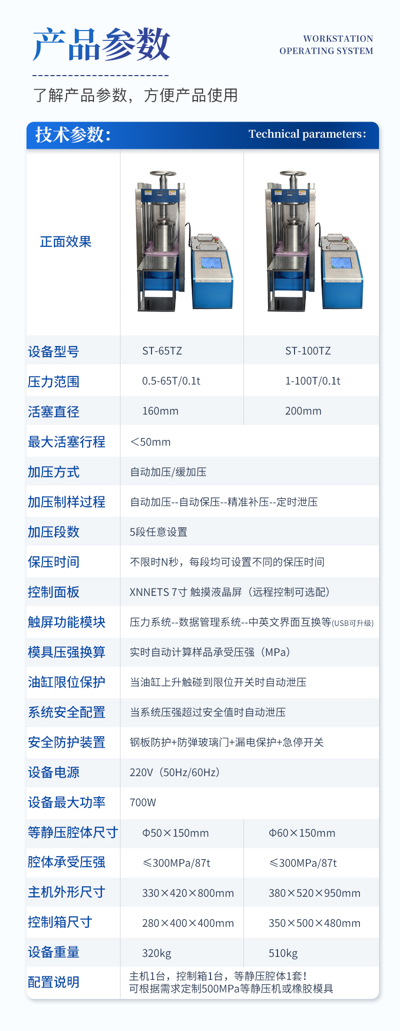 | 配置说明 | 主机1台,控制箱1台,等静压腔体1套!可根据需求定制500MPa等静压机或橡胶模具 |
