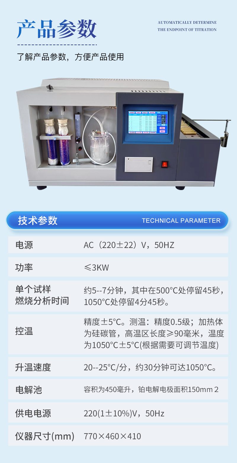 2、 单个试样燃烧分析时间:约5--7分钟,其中在500℃处停留45秒,1050℃处停留4分45秒。