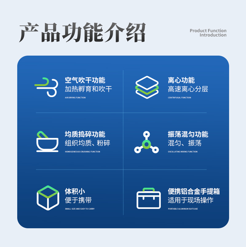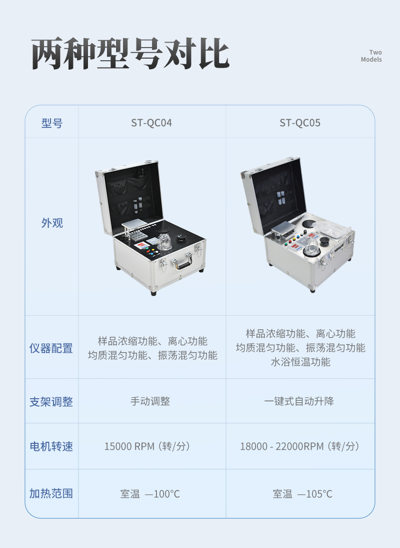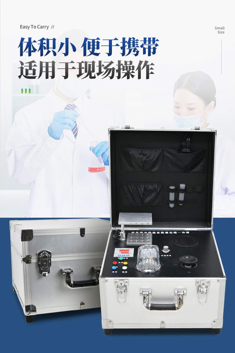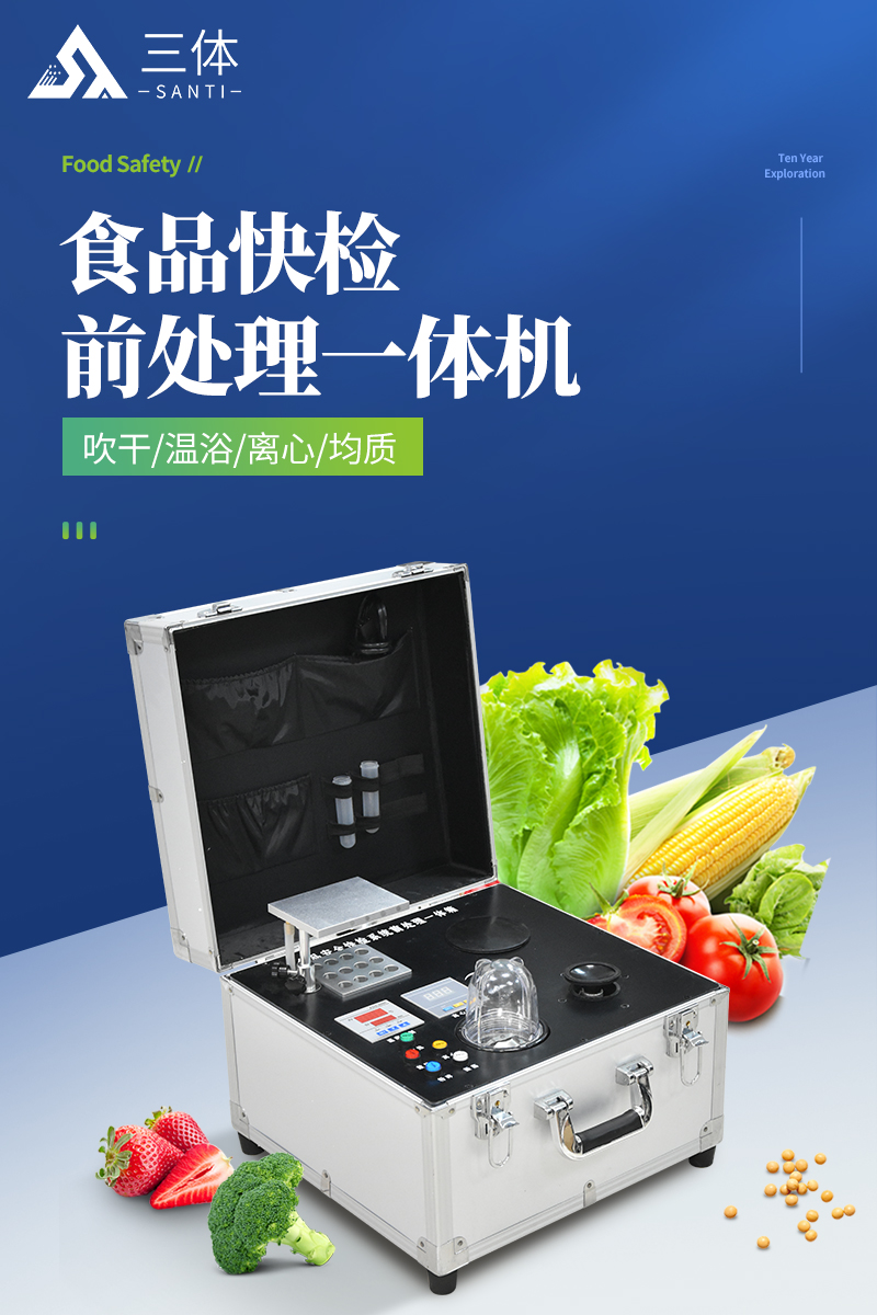 ST-QC04四合一食品安全检测前处理一体机(箱)是集吹干,温浴,离心,均质,混匀功能的一体化整合,极大的简化和集中样品前处理的一般操作过程,结合移动便携的全铝合金箱收纳功能,特别适合农兽药残留畜禽水产品质量安全现场快速检测。