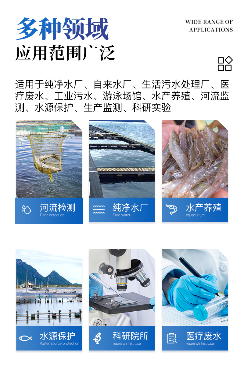 适用于纯净水厂、自来水厂、生活污水处理厂、**废水、工业污水、游泳场馆、水产养殖、河流监测、水源?;?、生产监测、科研实验等。
