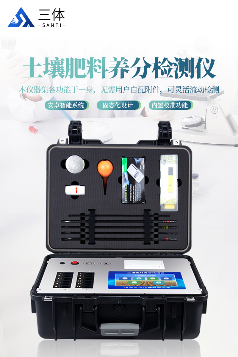 配套齐全:该仪器集药、器、仪为一体,携带方便,相当于一个小型移动实验室,无需用户自配附件,亦可灵活野外流动测试。适于农业服务部门或农资经销商、合作社、肥料厂商、大种植户测土施肥。